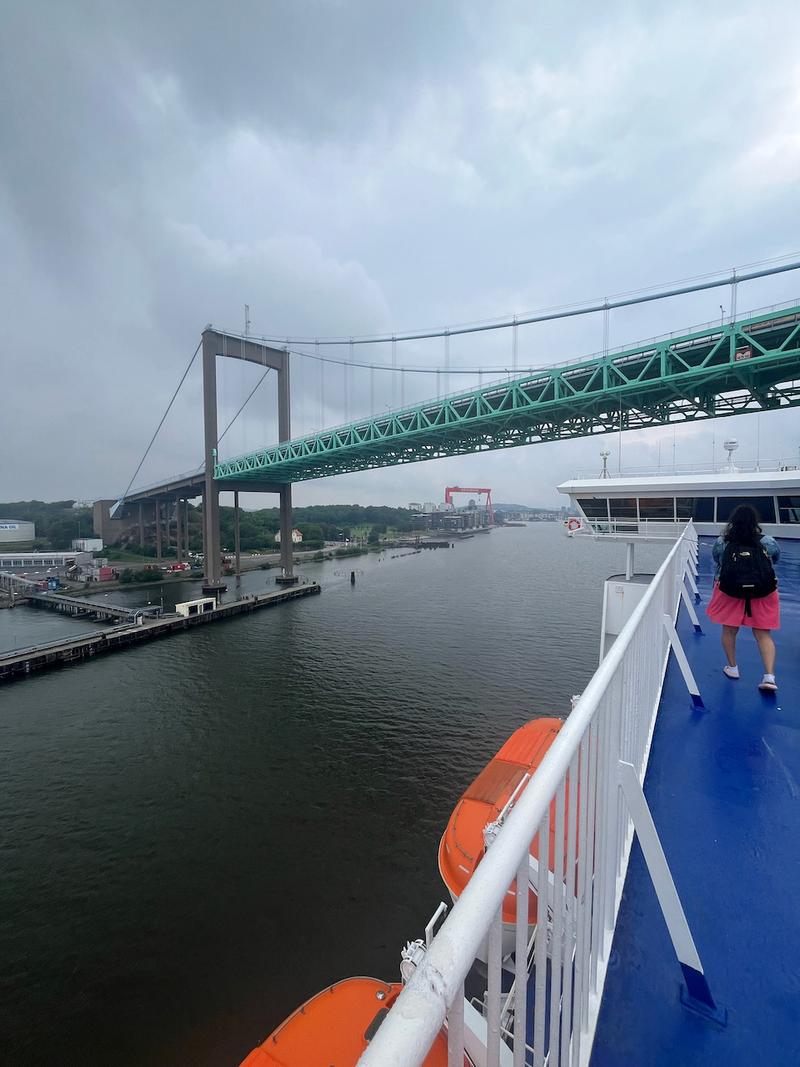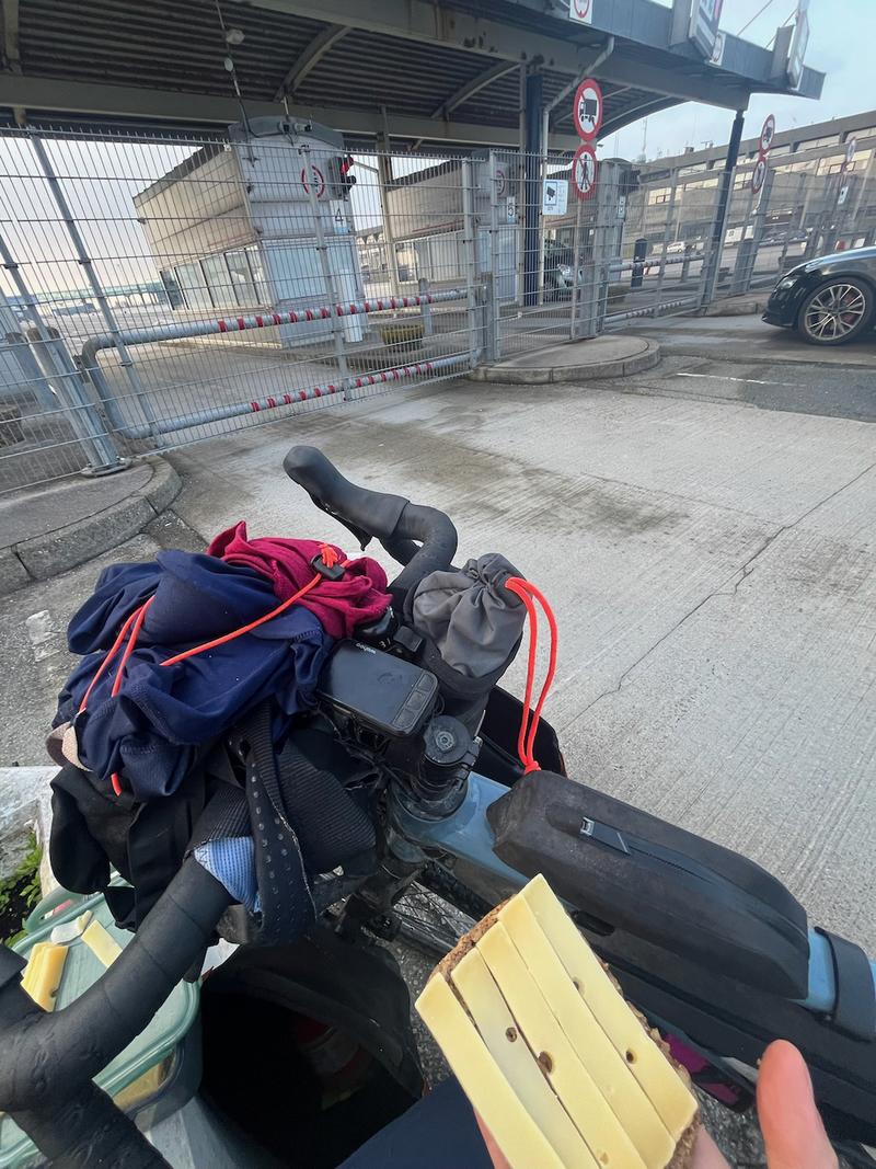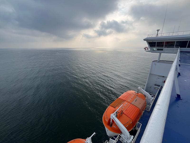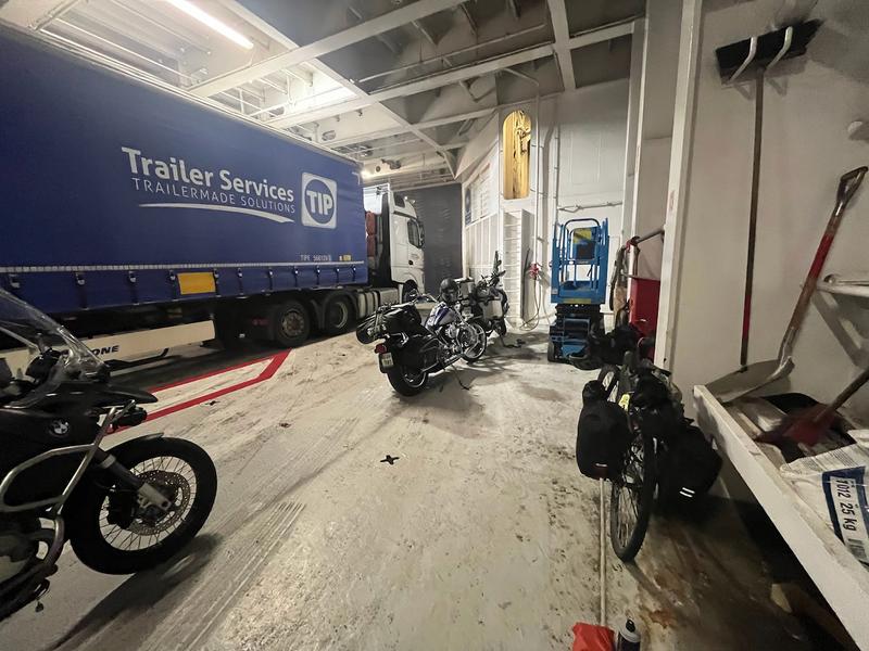 In Pole Position fahre ich in den Bug der Fähre. Witzig, mit dem Fahrrad vor den LKWs eingewiesen zu werden. Die Überfahrt verbringe ich quer über drei Sitze verteilt in tiefem Schlaf.
