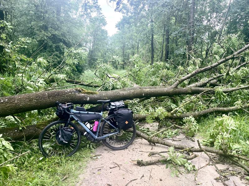 Das Wetter der letzten Tage hat einige Bäume auf die Strecke geweht – ich habe gelernt, dass ich mein Fahrrad, wenn ich die Gepäcktaschen abnehme, etwa auf Brusthöhe anheben kann. Ich habe auch gelernt, dass ich es nicht anheben kann, wenn die Gepäcktaschen noch dran sind (glauben Sie mir, ich habe es versucht).